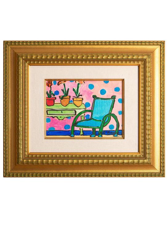 Titled: My Favorite Corner. Original acrylic on canvas. Artist signature in bottom right. Housed in ornate gold frame with cream colored matte. Sight size: 7.25”H x 9.25”W. Frame size: 17.5”H x 19.5”W.