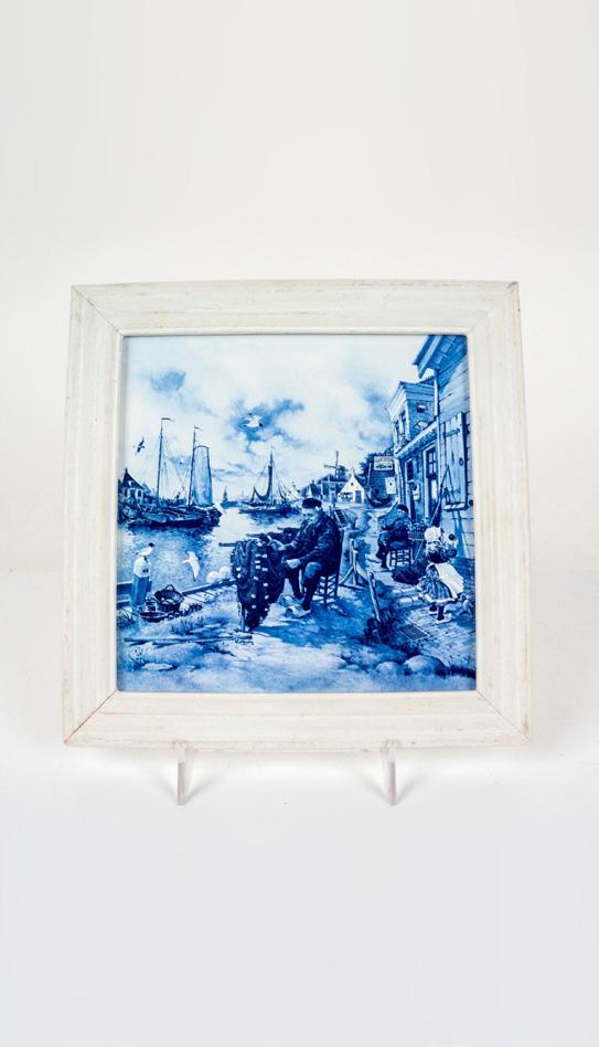 Hand blown and decorated blue and white scene depicting a small town and harbor scene with ships in the distance. Royal Moss Holland embossed on the back.