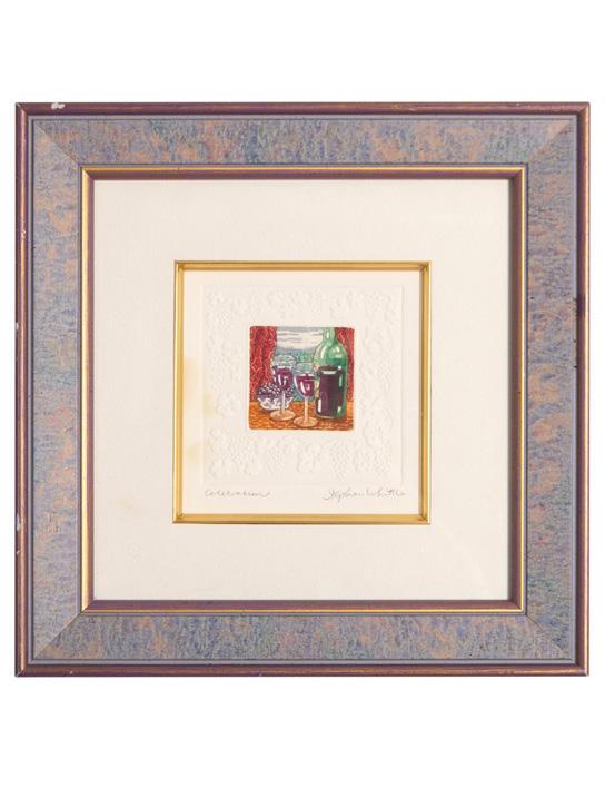 Etching with embossed edges of grapes and leaves.. Artist signed in pencil lower right. Housed in lavender frame with gold trim and cream colored matte. Sight size: 5”H x 5”W.