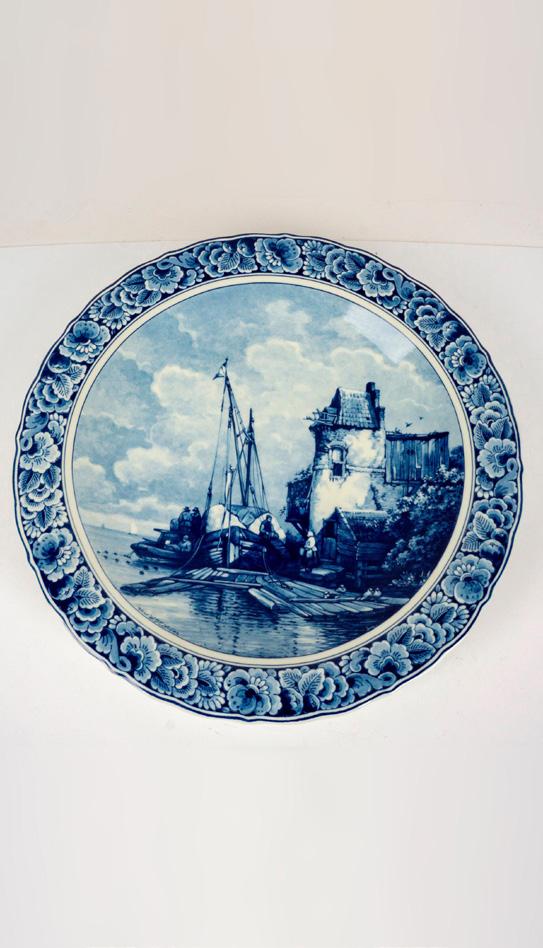 Limited edition large handmade porcelain plate decorated with a merchant ship at a dock. Artist signed to lower left side. Delft backstamp.