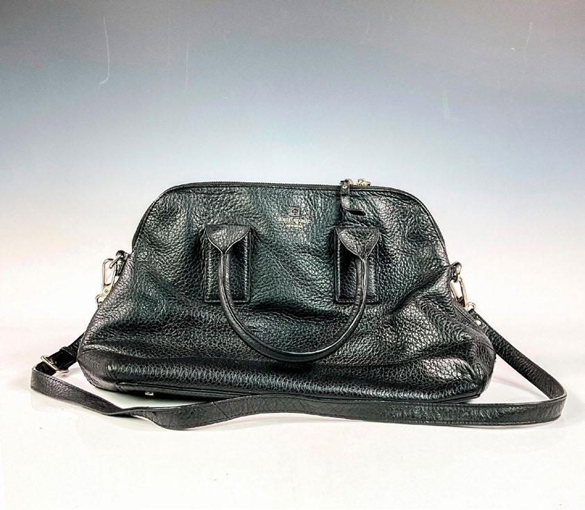 Black pebble exterior with double pull, top zippered closure, stitched handles and striped interior fabric. Interior pockets, zipper and slip. Should strap included. Kate Spade imprint on front and interior pocket. Cloth storage bag included.