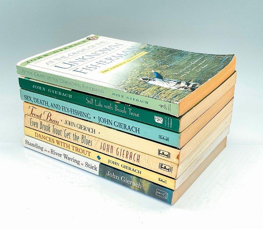 Collection of six hardcover John Gierach books including, All Fishermen Are Liars, A River Never Sleeps, Another Lousy Day in Paradise, To Know a River, At the Grave of the Unknown Fisherman, Fool’s Paradise. The shortest book has 184 pages, the longest 352 pages, with the largest measuring 6.25”L x 1.5”W x 8.75”H.