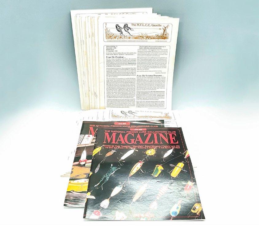 Group of newsletters from The National Fishing Lure Collector’s Club beginning with Volume 18, No. 61 Summer issue in 1994 ending with Volume 27, No. 92, 2002, missing several issues. Included are two N.F.L.C.C. magazines June 2002 and June 2003. These newsletters cover everything having to do with antique and vintage fishing lures.