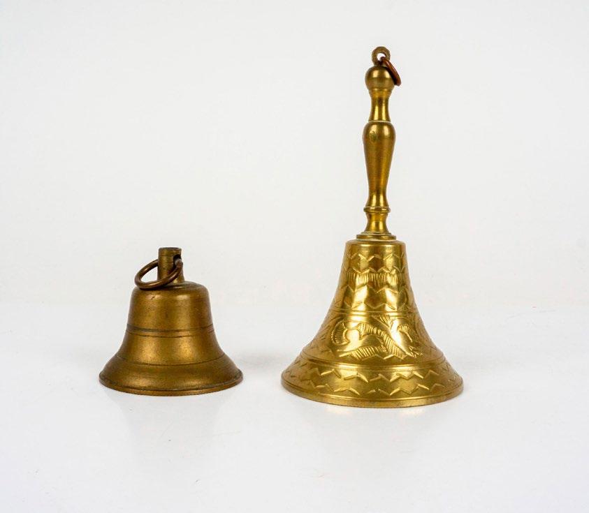 Lovely set of brass bells one with engraved foliage and geometric decorations. Larger bell is 4.4”H x 2.5”dia. Smaller one is 2”H x 2”dia.