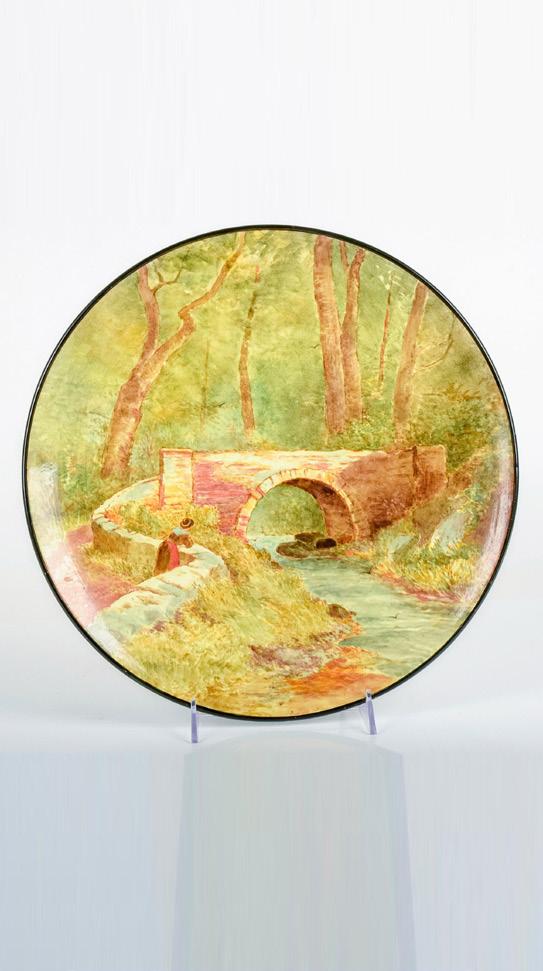 Depicting sheep grazing at sunset. Finely painted, with gilded rim.