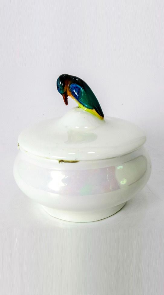 Finely painted in rich red, blue and orange, very detailed luster ware. Depicting an exotic bird seating on a tree. Model number 203.