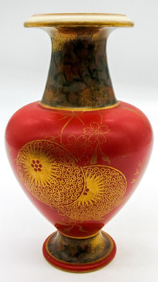 Glazed, in ochre red coloration, with gold floral design and accents, with colorfully marbled neck and foot. Doulton backstamp.