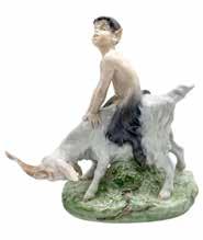 Figure of a boy riding a goat. Dressed in a blue and red stripe shirt and holding a duck. 1228; Royal Copenhagen backstamp. Artist’s signature on the side.