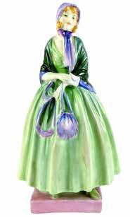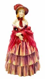 Depicted in colorful outfit and large hat with advertisement for a “Great Sale At Strike Hall”. With gilt accents. Royal Crown Derby backstamp.