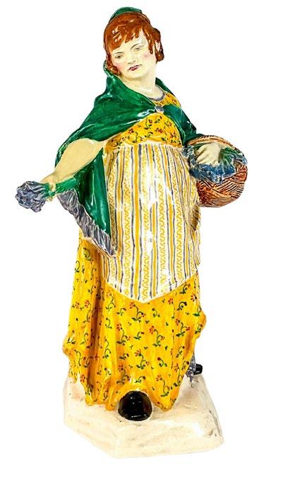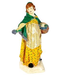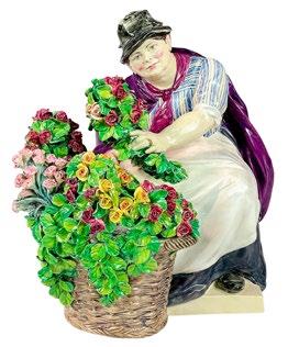 Earthenware glaze finish figure modelled as a street vendor woman seated with a basket of roses in front of her. Charles Vyse 1922 Chelsea marked to bottom.
