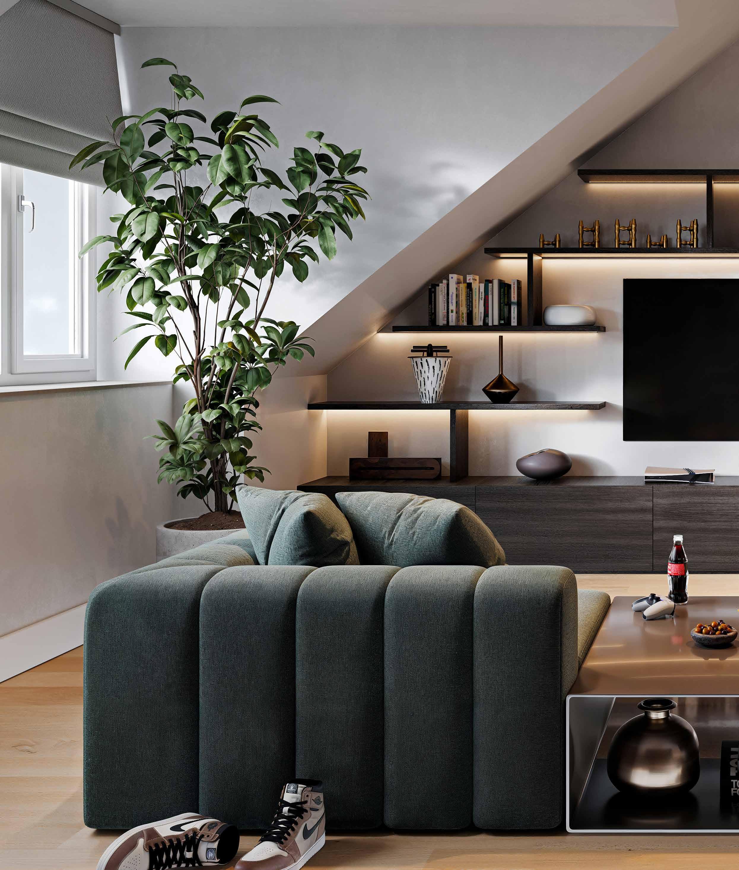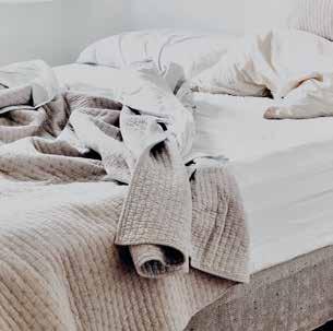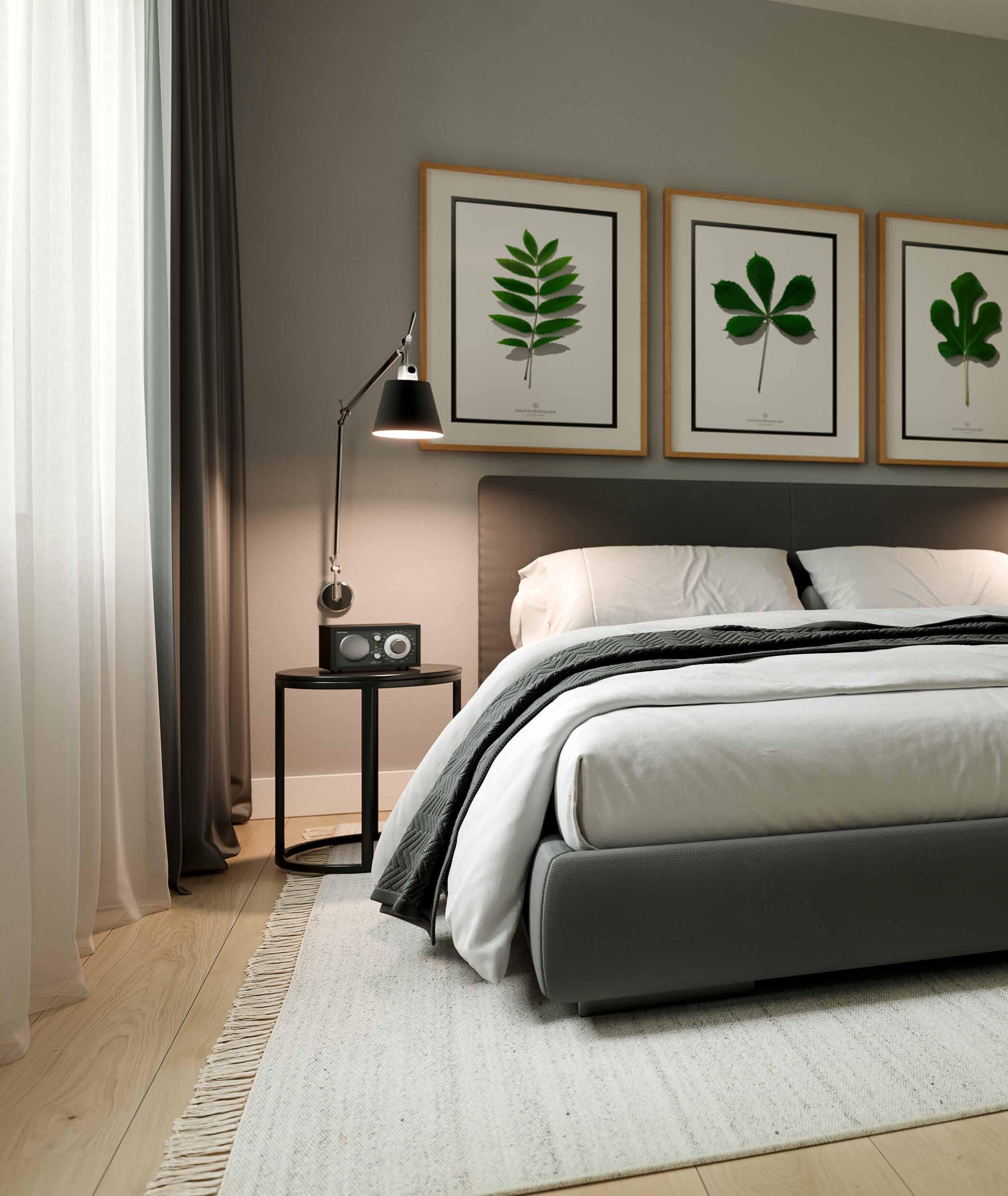 Voor de inloopdouche hadden Emily en Puru voorkeur voor een industrieel ogende douchewand. De master bedroom is nog een ‘project voor de toekomst’, zegt Emily. Nu volstaan ze hier voorlopig met een box-spring en gordijnen in dezelfde kleur. Ook voor de zolder zijn er toekomstplannen (een dakkapel).