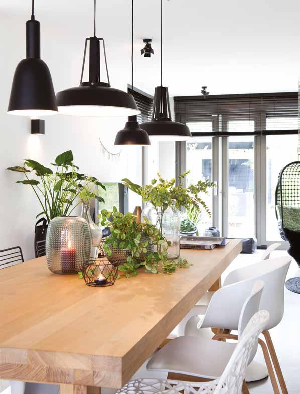 aansluit op de tuin. De eethoek - robuust houten blad en beige stoelen met zwart onderstel - vormt de natuurlijke verbinding tussen keuken- en zitgedeelte. De Secto designlamp is hier een ware eyecatcher. Landelijk