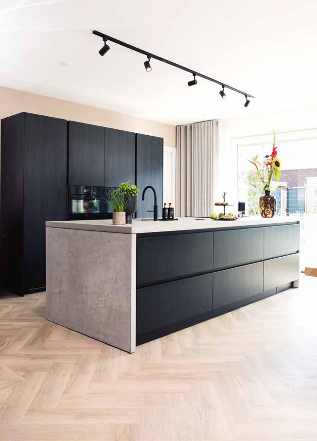 Door de brede zwarte omlijsting springen de kleuren er nog beter uit. En de zwarte lijst biedt verbinding met andere zwarte elementen in de ruimte, zoals de stalen toegangsdeur (met getint glas) en de fronten van de keuken, die in een zwarte houtnerf zijn uitgevoerd. Opvallend in de keuken is verder het betonnen werkblad dat aan beide kanten doorloopt tot de vloer.