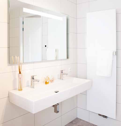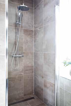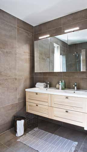 De badkamer heeft een natuurlijke uitstraling dankzij de bruinbeige tinten van de tegels. “Het vrijstaande, ruime ligbad hebben we gecombineerd met de inloopdouche die gewoon lekker basic is. De indirecte verlichting achter de grote spiegel geeft een mooi effect. We hebben gekozen voor een separaat toilet op deze verdieping en daardoor is één van de slaapkamers aan de voorkant dan iets kleiner geworden.”