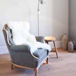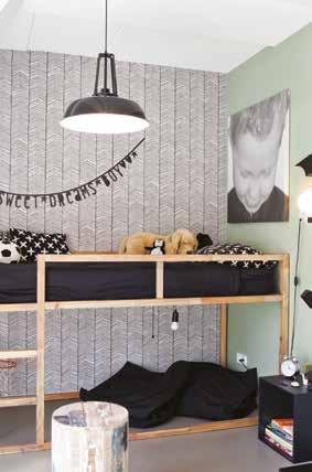 Voor de vloer en de wanden kozen ze voor lichte, warme tinten. De pvcvloer met houtlook en visgraatmotief is de rustige basis waarop de meubels, veelal in meer donkere tinten, goed tot hun recht komen. “Die meubels hebben daarmee een wat stoerdere uitstraling.” Ze omschrijft de interieurstijl als een ‘combinatie van landelijk, industrieel en chic’. Een echte eyecatcher in de kamer is een groot, kleurig schilderij dat is gemaakt door de moeder van Rosie, kunstenaar Ans van Santvoort (www.ansvansantvoort.nl).
