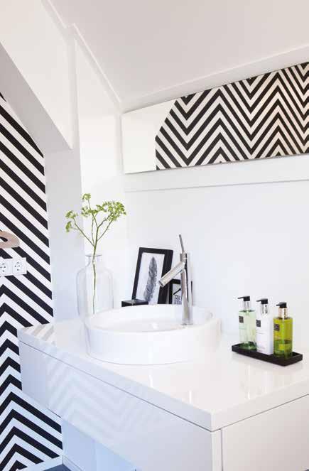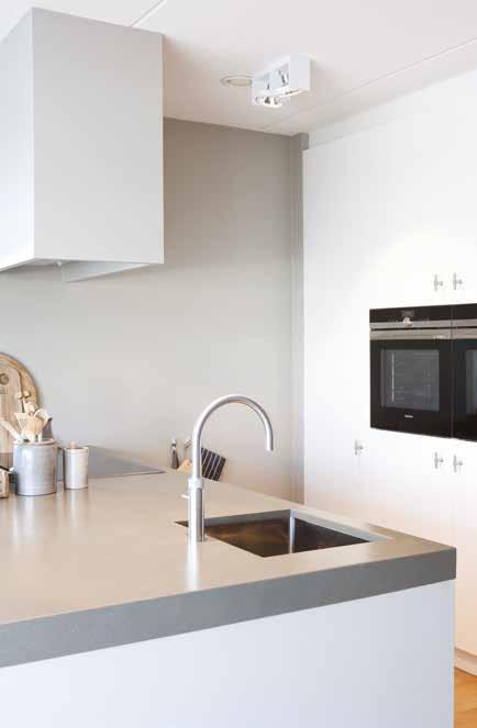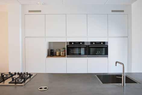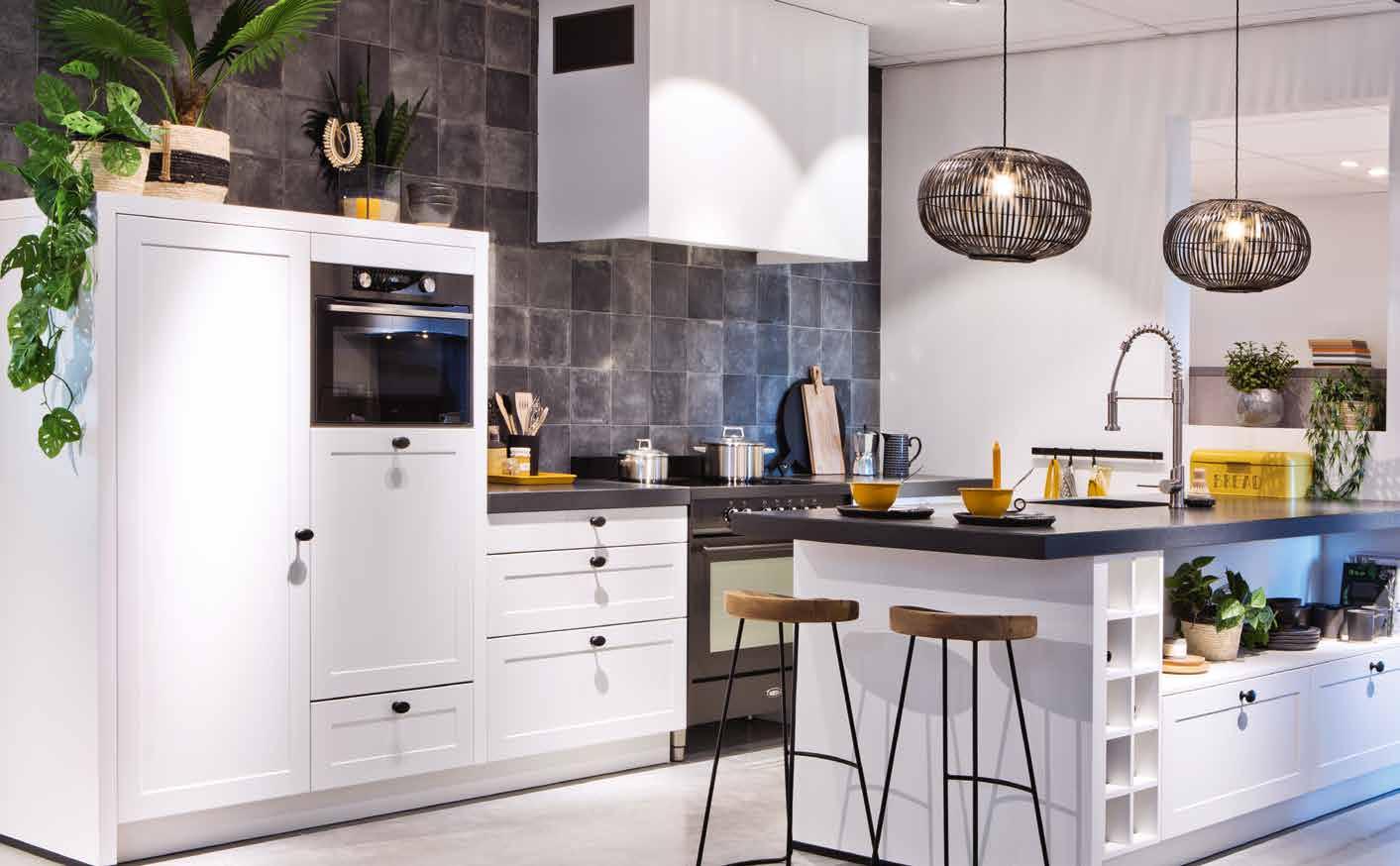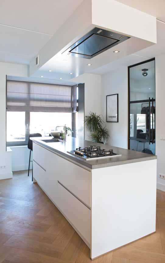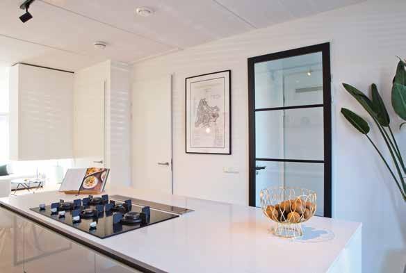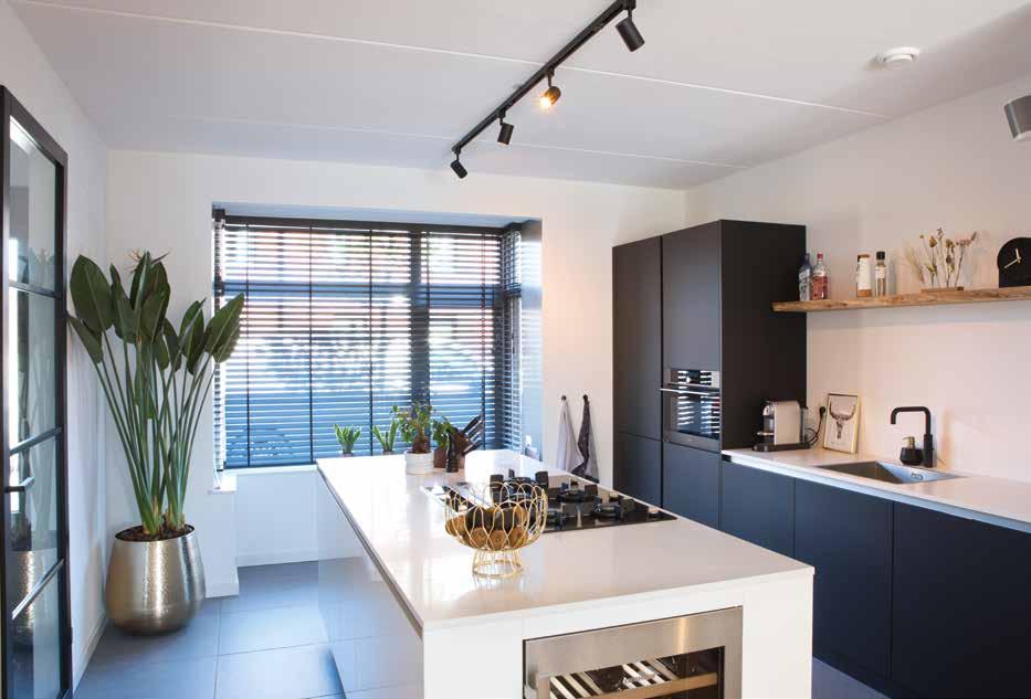 In de keuken kozen zij voor iets meer contrast: een wit kookeiland met op de kopse kant een wijnklimaatkast en tegen de wand een zwarte kast met veel bergruimte, een magnetron en een wit aanrechtblad en spoelbak. Op de vloer lichte grijze keramische tegels. Met bamboe shutters in de erker kunnen ze het daglicht naar wens regelen. De stalen deur met grote glasvlakken zorgt in de woning voor een extra ruimtelijke indruk.