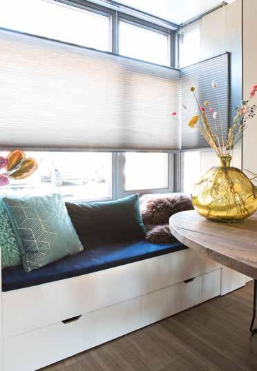 “Hier zitten we eigenlijk het meest en we hebben dankzij die erker een leuk zicht op de straat. De zonwering Duette biedt veel privacy. We hebben die meestal in deze stand staan, zodat we er onderdoor kunnen kijken.”