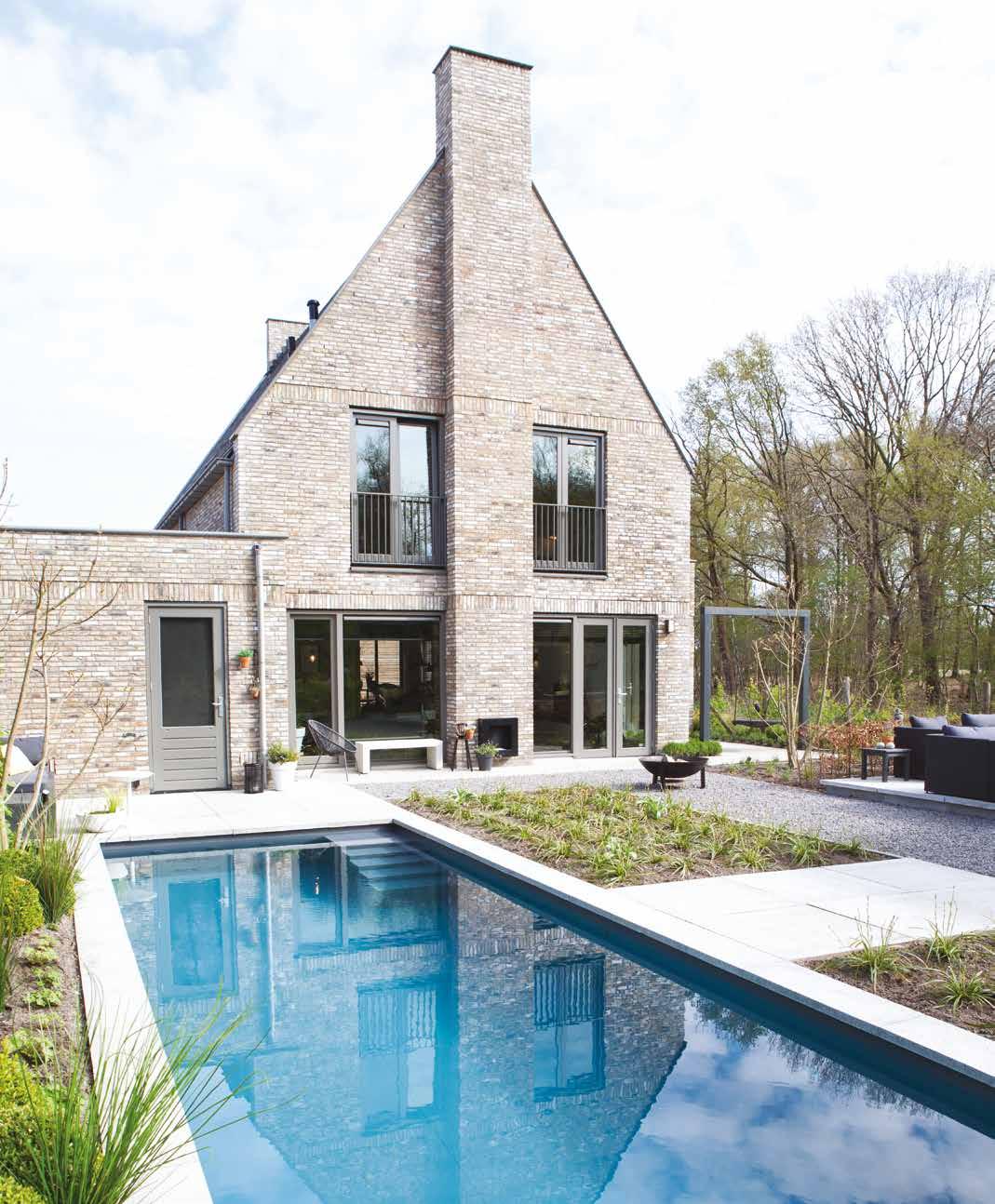 Aan de achterzijde van de woning is het niet alleen relaxen geblazen op de loungebanken of gezellig tafelen aan de ‘betonnen’ eethoek. Er kan ook gesport en gespeeld worden in het zwembad van 4 bij 9 meter. “Dat was vooral een wens van mij”, vertelt Sylvia, “ik ben wedstrijdzwemster geweest en ik ben graag in het water. Voor ik ’s middags onze jongste zoon uit school ga halen, heb ik er vaak al 70 baantjes opzitten.” Voor de kinderen is zo’n zwembad natuurlijk ook heerlijk.
