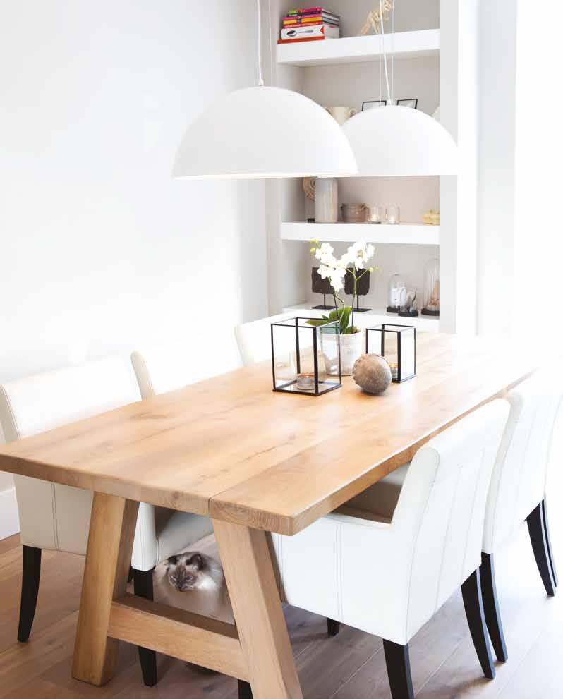 Kristy en Jeroen hebben het interieur van de woonkamer verder grotendeels rustig en tijdloos gehouden, met vooral lichte kleuren en een warme houten vloer. Ook het metalen onderstel van de eettafel met een zwart composiet blad hebben vader en zoon zelf gelast.