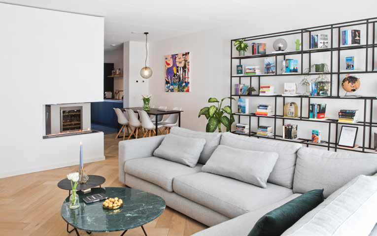 Het resultaat mag er zijn. Afwisseling in de manier waarop de boeken zijn geplaatst, enkele andere kleurige elementen en voldoende zicht op de witte achterwand maken deze kast tot het pronkstuk van de woonkamer. In combinatie met de lichtgrijze zithoek en de bioethanolhaard een heerlijke plek in de ruime woonkamer. Over de haard zegt Jeroen: “Om de grote open ruimte te breken hebben we gekozen voor een doorkijkhaard. Hierdoor krijg je vanaf de bank het gevoel dat je in een aparte ruimte zit, terwijl je toch contact houdt met de keuken.”