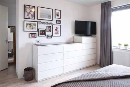 Tijd om de trap op te gaan voor de rust van de slaapkamers. De master bedroom aan de achterzijde van de woning biedt plaats aan een riant tweepersoons bed in een rustgevend bomenrijk decor. Wie denkt dat hier geen tv wordt gekeken, heeft het mis. Want die kan met één druk op de knop uit het voeteneinde omhoog getoverd worden. Om het ruimtelijk te houden ontbreekt de kast hier wel, want Angelo en Rosie hebben een van de kleinere kamers aan de voorzijde als inloopkast ingericht. De andere kamer fungeert als werkkamer. Op de hele eerste verdieping ligt laminaat.