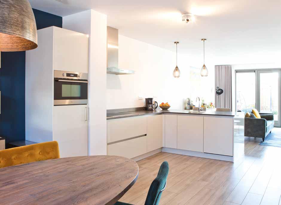 De bijbehorende royale witte wandkast zorgt voor veel bergruimte en biedt bovendien plek aan een magnetron, een oven en een nisje. In de overgang van keuken naar zithoek heeft hij het houten tafelblad van de eettafel ovaal laten maken om de doorloop zo breed mogelijk te houden. De donker beklede stoelen geven aan de eethoek een warme sfeer, zeker in combinatie met de warmkleurige verlichting.
