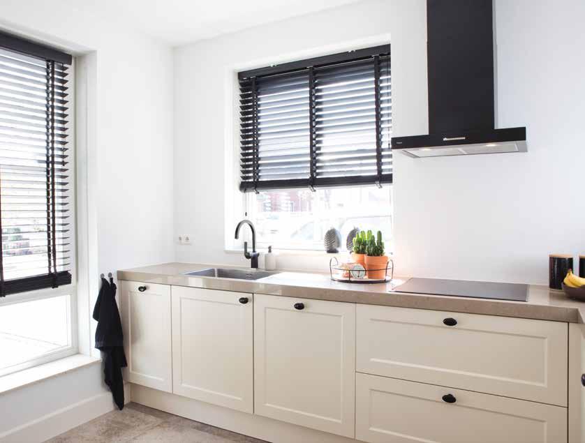 In de keuken kozen zij voor iets meer contrast: een wit kookeiland met op de kopse kant een wijnklimaatkast en tegen de wand een zwarte kast met veel bergruimte, een magnetron en een wit aanrechtblad en spoelbak. Op de vloer lichte grijze keramische tegels. Met bamboe shutters in de erker kunnen ze het daglicht naar wens regelen. De stalen deur met grote glasvlakken zorgt in de woning voor een extra ruimtelijke indruk.