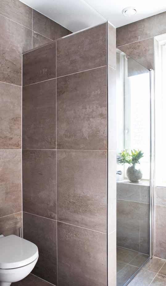 Op de eerste etage is de badkamer iets vergroot, omdat Anouk en René zowel een bad als inloopregendouche wilden. Om een stoere uitstraling te verkrijgen is gekozen voor een grote tegel in betonlook, een vloertegel die ook op de wanden is toegepast. De eerste verdieping bevat verder drie slaapkamers en op de zolder is een vierde kamer gerealiseerd. “Dat is een hele fijne lichte kamer geworden, omdat we 4 dakvensters hebben laten aanbrengen.”
