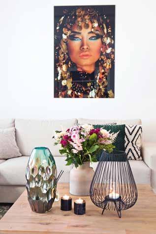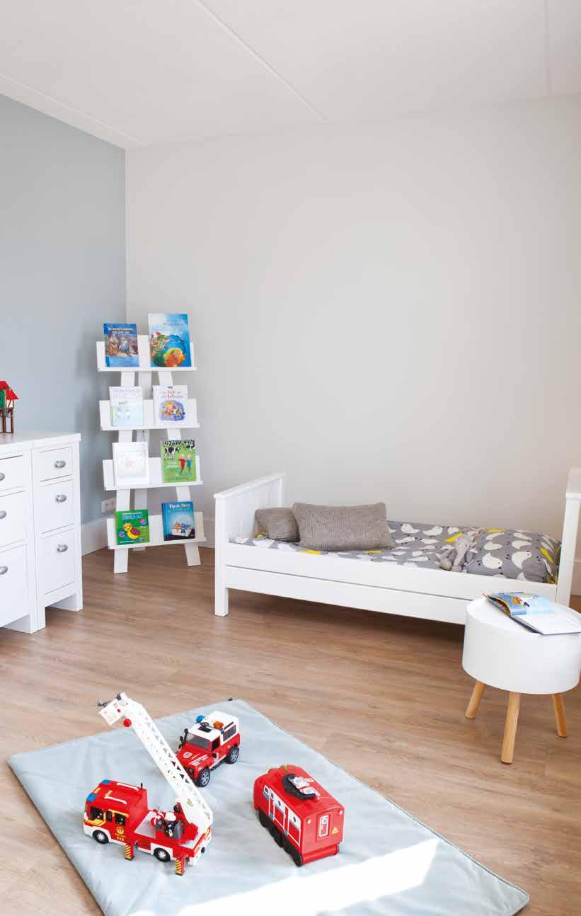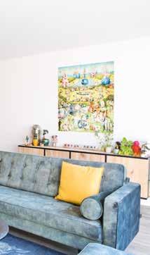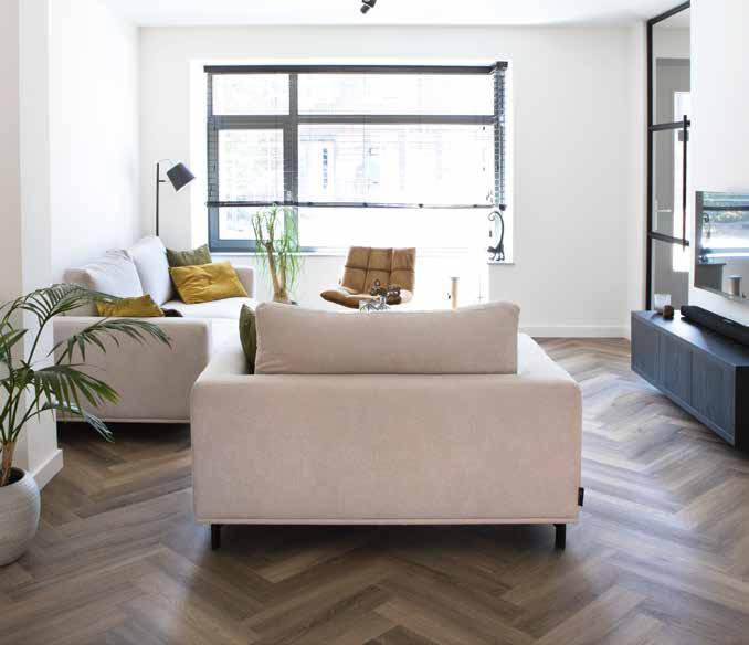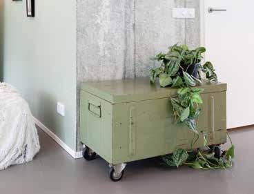 Voor de vloer en de wanden kozen ze voor lichte, warme tinten. De pvcvloer met houtlook en visgraatmotief is de rustige basis waarop de meubels, veelal in meer donkere tinten, goed tot hun recht komen. “Die meubels hebben daarmee een wat stoerdere uitstraling.” Ze omschrijft de interieurstijl als een ‘combinatie van landelijk, industrieel en chic’. Een echte eyecatcher in de kamer is een groot, kleurig schilderij dat is gemaakt door de moeder van Rosie, kunstenaar Ans van Santvoort (www.ansvansantvoort.nl).