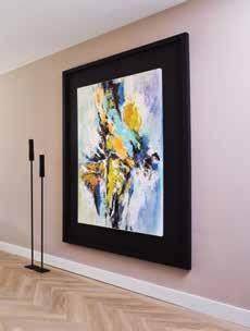 Door de brede zwarte omlijsting springen de kleuren er nog beter uit. En de zwarte lijst biedt verbinding met andere zwarte elementen in de ruimte, zoals de stalen toegangsdeur (met getint glas) en de fronten van de keuken, die in een zwarte houtnerf zijn uitgevoerd. Opvallend in de keuken is verder het betonnen werkblad dat aan beide kanten doorloopt tot de vloer.