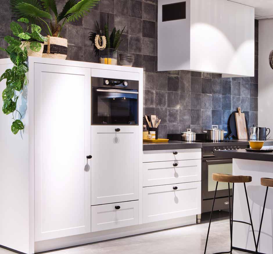 “We hebben gekozen voor een vrij lange keuken, met een lang aanrecht. We hebben het lekker praktisch gehouden; we zijn geen mensen die uren in de keuken staan. Veel werkruimte, handige apparatuur, alles in mat witte kleuren en voldoende plek om er – dankzij 4 krukken – ook te kunnen ontbijten.”