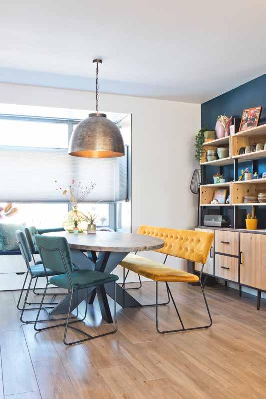 Opvallend is de invulling van de erker aan de voorzijde van de woonkamer met een op maat gemaakte zitbank met bergruimte. Daarvoor staat de ovale eettafel met een houten blad en een metalen onderstel, drie eetkamerstoelen en een geel zitbankje. De grote metalen lamp biedt een accent dat aansluit bij de industriële architectuurstijl van de woningen. De wandkast in dit deel van de woonkamer, gemaakt van hout en metaal, vormt een mooi contrast met het Haags blauw van de wand erachter. De zus van Anouk is interieuradviseur en heeft geadviseerd over de inrichting en de kleurstelling. “Zelf hadden we sommige kleuren misschien niet aangedurfd, maar het is allemaal erg mooi geworden.”