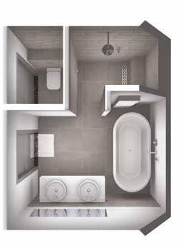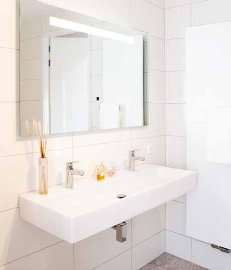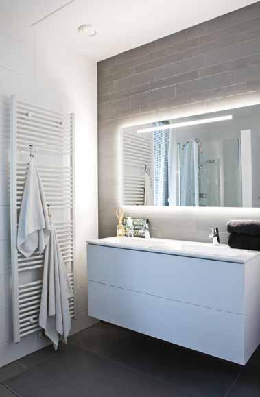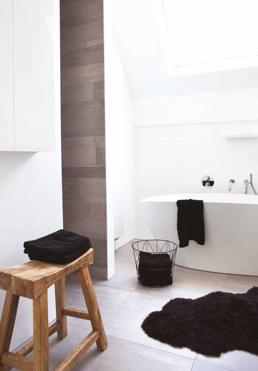 De badkamer heeft een natuurlijke uitstraling dankzij de bruinbeige tinten van de tegels. “Het vrijstaande, ruime ligbad hebben we gecombineerd met de inloopdouche die gewoon lekker basic is. De indirecte verlichting achter de grote spiegel geeft een mooi effect. We hebben gekozen voor een separaat toilet op deze verdieping en daardoor is één van de slaapkamers aan de voorkant dan iets kleiner geworden.”