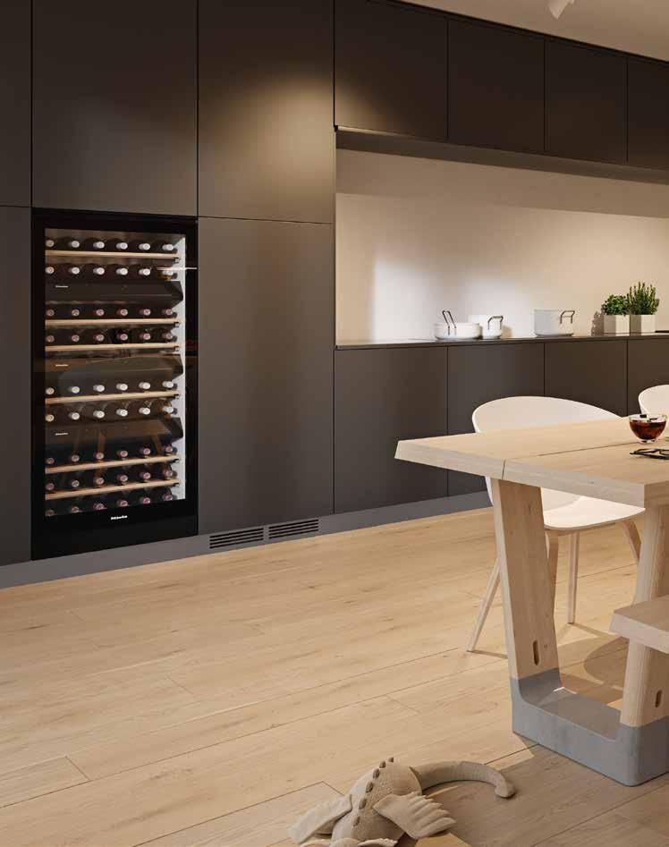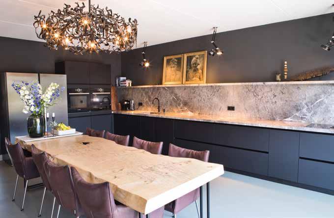 De matzwarte keuken is maar liefst 6,6 meter lang geworden met een werkblad en achterwand van Fiore di Bosco marmer en een Bora inductiekookplaat met geïntegreerde afzuiging. Voor de verlichting van het werkblad zijn industriële spots van Modular toegepast. Tegen de wand tussen keuken en zithoek is een groot wandmeubel met oven, magnetron en bergruimte geplaatst. Daarnaast staat een losse ijskast met dubbele deur.