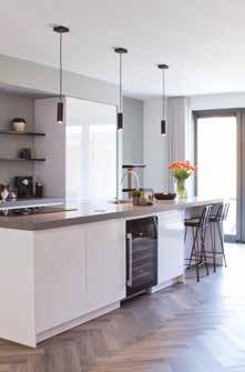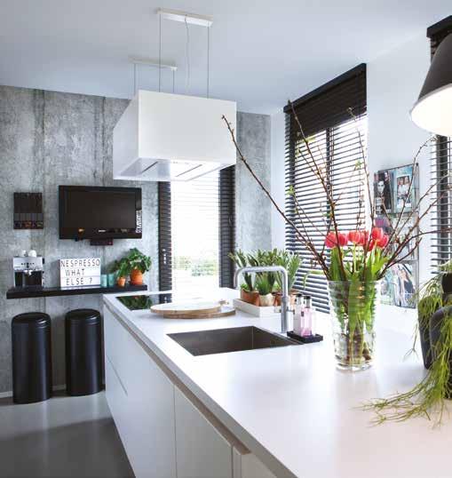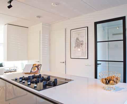 De keuze voor een stalen deur met glas tussen hal en woonkamer draagt eveneens bij aan de sfeer van ruimtelijkheid en licht die Mathijs nastreeft. “Het maakt de keuken meteen een stuk groter.” Een wit kookeiland met grijs werkblad en een grote strakke spoelbak geeft hem volop kans zijn kooktalent te ontplooien. Het kookeiland heeft een barretje met twee krukken aan de kant van de erker aan de voorzijde van de woning. Afzuigkap en lichtspotjes zijn verwerkt in een koof onder het plafond.