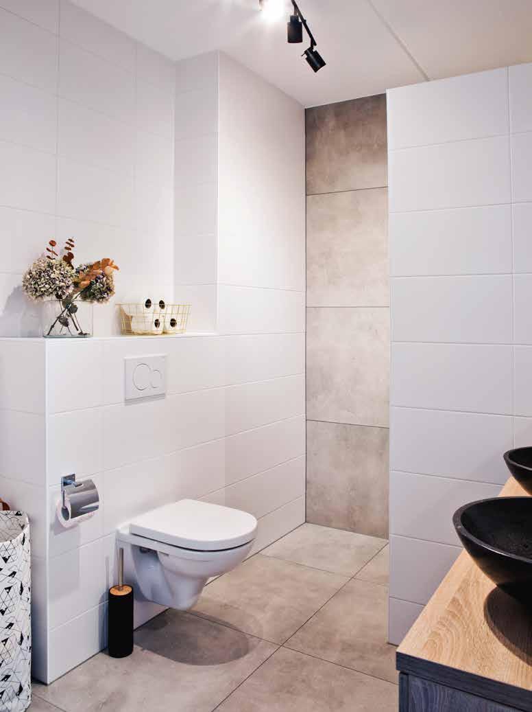 Op de eerste verdieping lieten Jeroen en Kristy de badkamer iets vergroten voor een wat ruimere inloopregendouche, een toilet en een houten badkamermeubel met dubbele wasbak. De witte en lichtbeige tegels zorgen dat het licht en ruimtelijk oogt. Verder zijn er op de eerste etage drie slaapkamers en de zolderruimte is ingericht als privé ‘sportschool’.