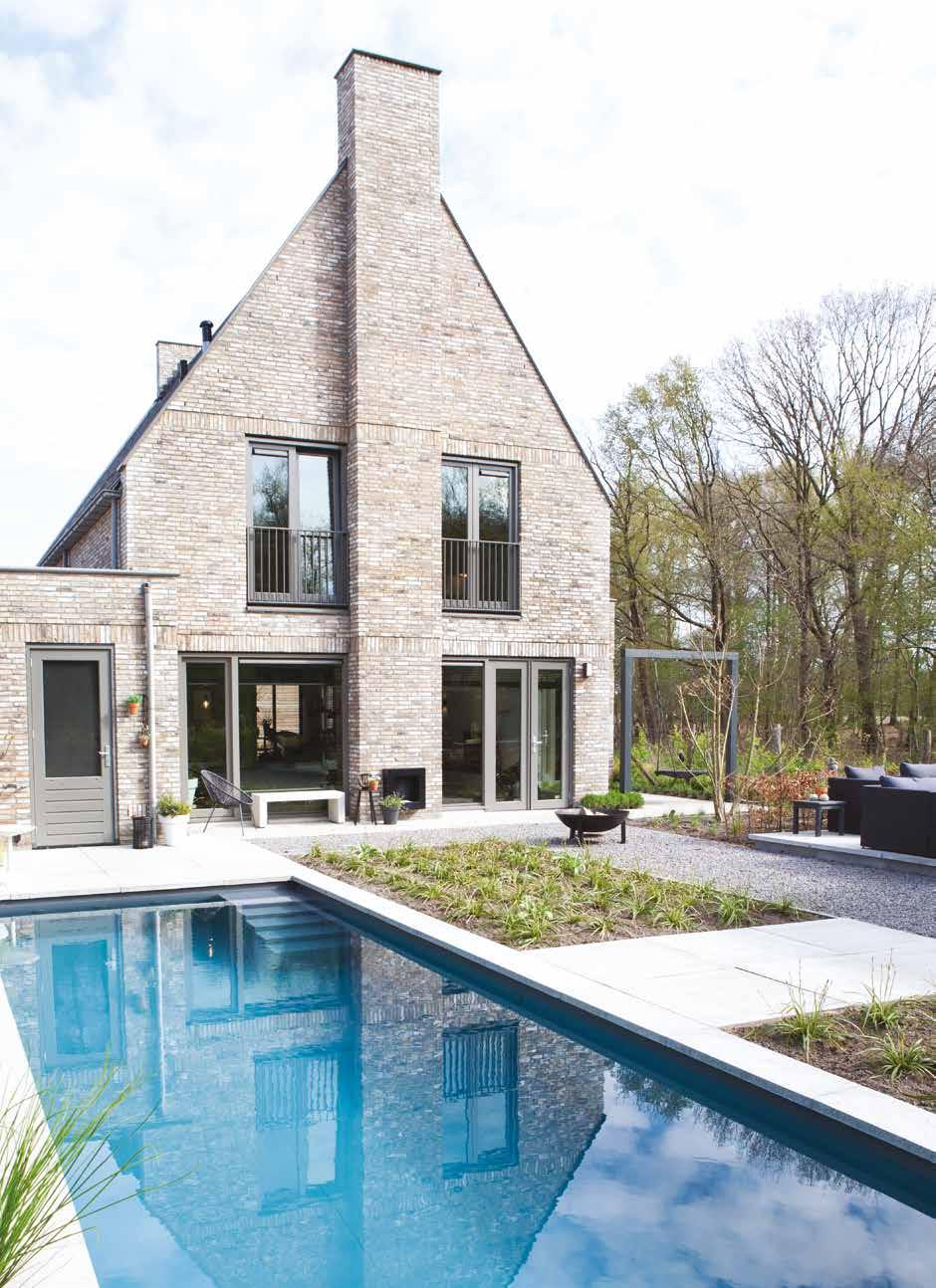 Aan de achterzijde van de woning is het niet alleen relaxen geblazen op de loungebanken of gezellig tafelen aan de ‘betonnen’ eethoek. Er kan ook gesport en gespeeld worden in het zwembad van 4 bij 9 meter. “Dat was vooral een wens van mij”, vertelt Sylvia, “ik ben wedstrijdzwemster geweest en ik ben graag in het water. Voor ik ’s middags onze jongste zoon uit school ga halen, heb ik er vaak al 70 baantjes opzitten.” Voor de kinderen is zo’n zwembad natuurlijk ook heerlijk.