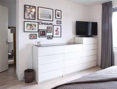 Tijd om de trap op te gaan voor de rust van de slaapkamers. De master bedroom aan de achterzijde van de woning biedt plaats aan een riant tweepersoons bed in een rustgevend bomenrijk decor. Wie denkt dat hier geen tv wordt gekeken, heeft het mis. Want die kan met één druk op de knop uit het voeteneinde omhoog getoverd worden. Om het ruimtelijk te houden ontbreekt de kast hier wel, want Angelo en Rosie hebben een van de kleinere kamers aan de voorzijde als inloopkast ingericht. De andere kamer fungeert als werkkamer. Op de hele eerste verdieping ligt laminaat.