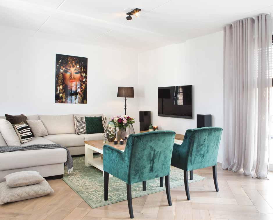 Ze kozen voor lichte kleuren en redelijk strakke lijnen in de inrichting van de woonkamer. De zithoek is gesitueerd aan de voorzijde van de woning, waar ze een mooi uitzicht op het parkje aan de overkant van de straat hebben.
