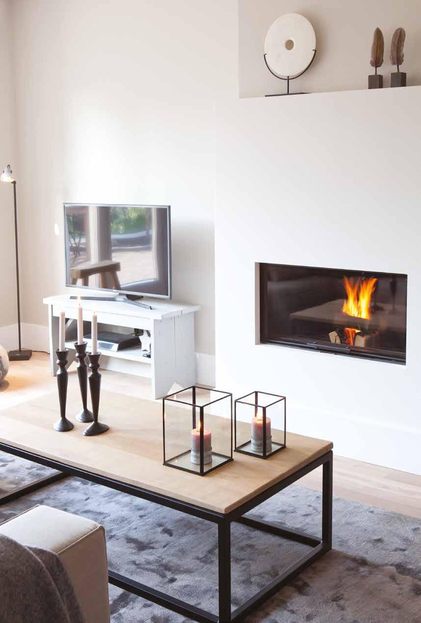 Het resultaat mag er zijn. Afwisseling in de manier waarop de boeken zijn geplaatst, enkele andere kleurige elementen en voldoende zicht op de witte achterwand maken deze kast tot het pronkstuk van de woonkamer. In combinatie met de lichtgrijze zithoek en de bioethanolhaard een heerlijke plek in de ruime woonkamer. Over de haard zegt Jeroen: “Om de grote open ruimte te breken hebben we gekozen voor een doorkijkhaard. Hierdoor krijg je vanaf de bank het gevoel dat je in een aparte ruimte zit, terwijl je toch contact houdt met de keuken.”