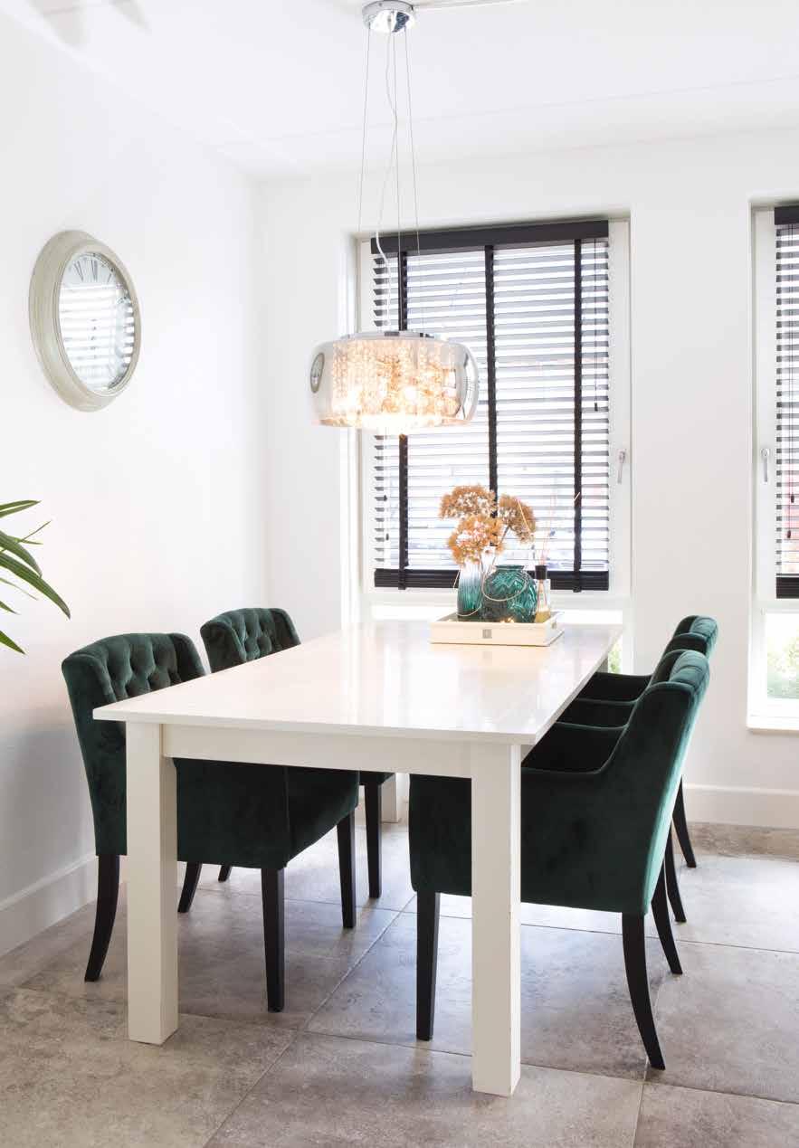 Ook aan de eettafel is een bijzonder verhaal verbonden. Het houten blad is gemaakt van een boom die Rosies vader ooit met zijn vader heeft geplant. Een mooi stukje verbinding met de familiegeschiedenis. Daarnaast is de eettafel ook lekker groot. Er is plaats voor maar liefst acht personen die gebruik kunnen maken van prettig zittende, met velours beklede eetstoelen in donkere zwarte en groene tinten. Natuurlijk kan er zonodig ook aan deze tafel gewerkt worden, bovendien met goed zicht op de achtertuin. “Die tuin gaan we in de toekomst nog mooier maken.”