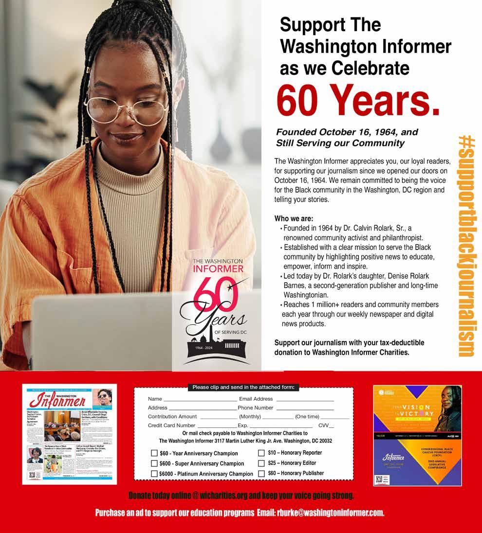 THE WASHINGTON INFORMER NEWSPAPER (ISSN#0741-9414) is published weekly on each Thursday. Periodicals postage paid at Washington, D.C. and additional mailing offices. News and advertising deadline is Monday prior to publication. Announcements must be received two weeks prior to event. Copyright 2016 by The Washington Informer. All rights reserved. POSTMASTER: Send change of addresses to The Washington Informer, 3117 Martin Luther King, Jr. Ave., S.E. Washington, D.C. 20032. No part of this publication may be reproduced without written permission from the publisher. The Informer Newspaper cannot guarantee the return of photographs. Subscription rates are $96 per year, two years $168. Papers will be received not more than a week after publication. Make checks payable to: