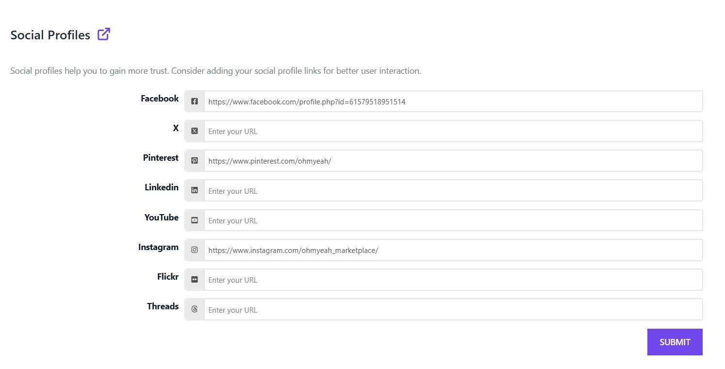 Social media helps you to gain more trust. Sharing your social links helps build a following and drive more traffic to YOUR store. This section is where you’ll add profile links for better user interaction.