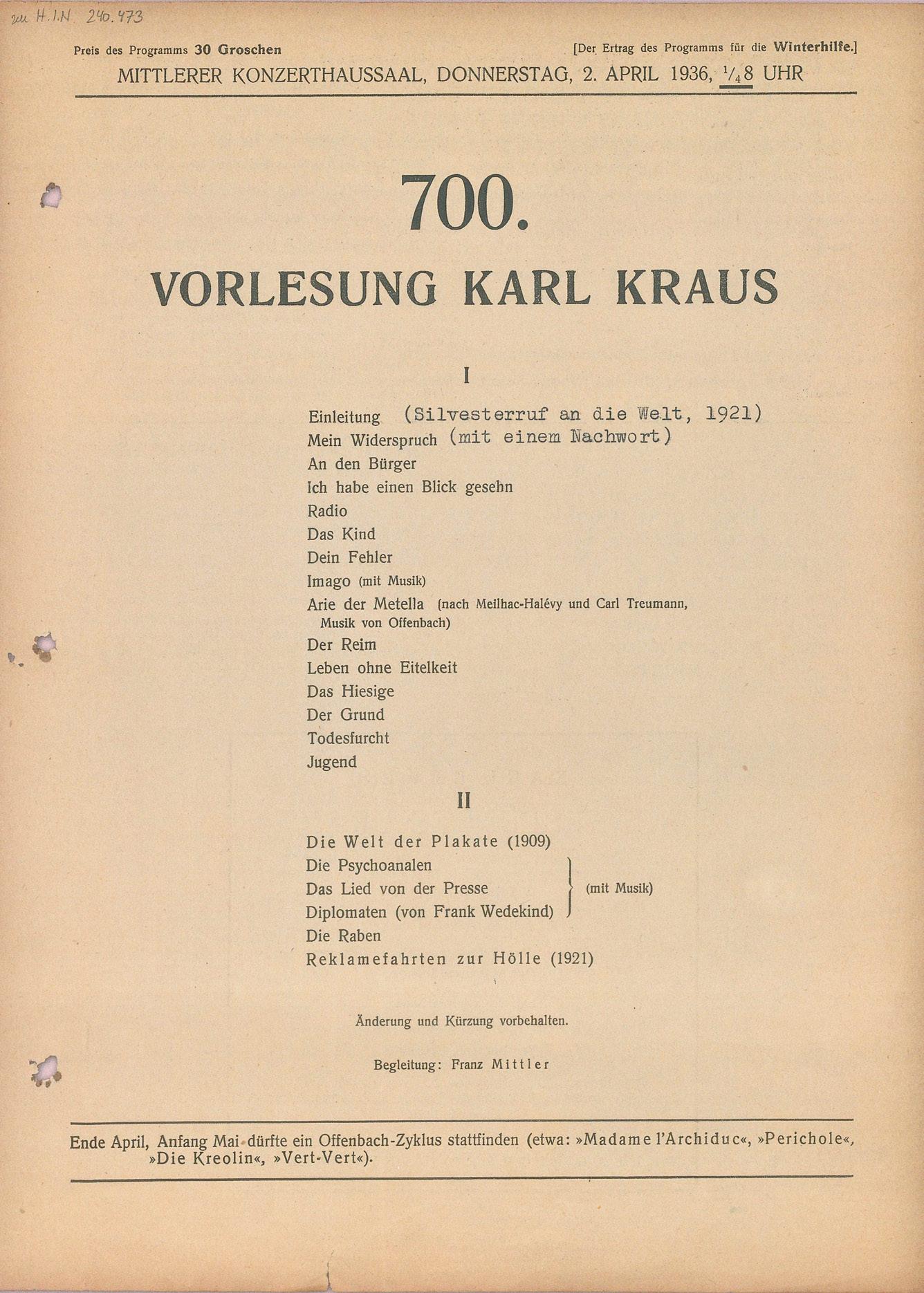 Programmzettel der 700. Vorlesung von Karl Kraus am 2.April 1936. WBR, HS, H.I.N. 240473