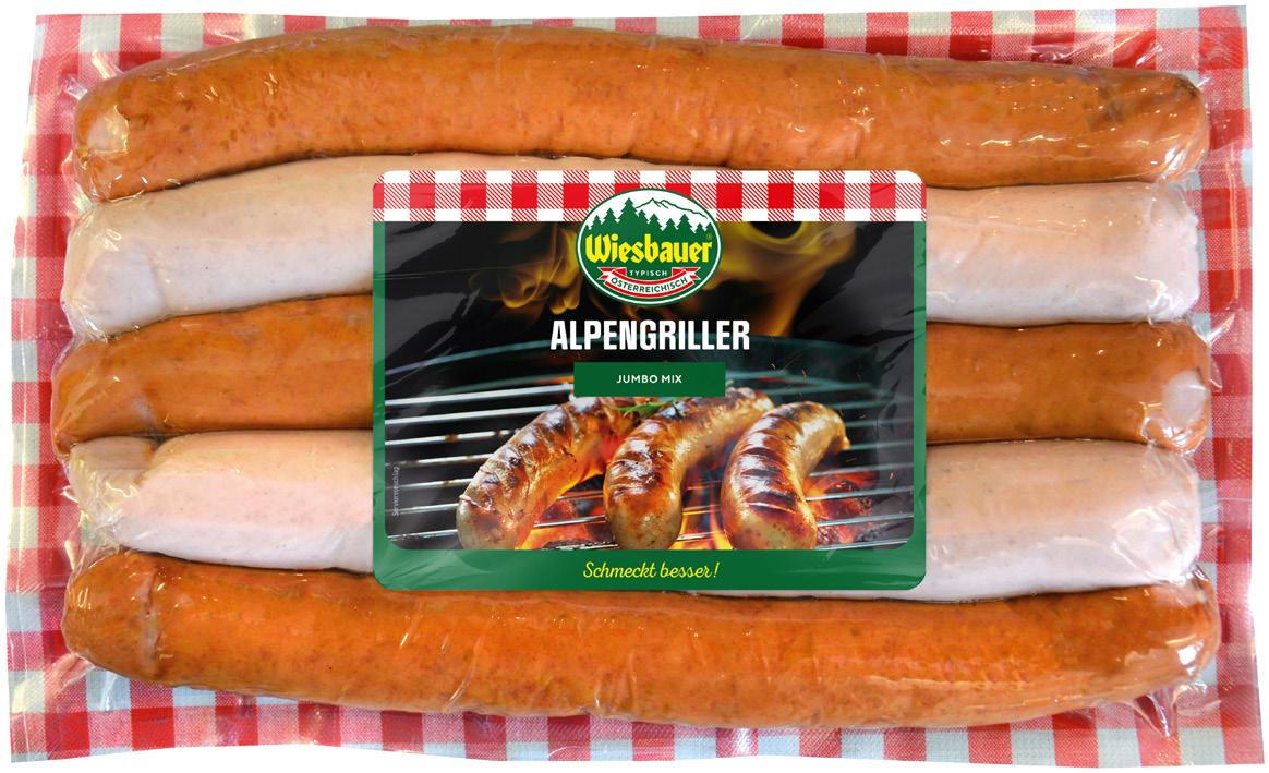 Der Alpengriller Jumbo besteht aus: 3x Jumbo Käsekrainer: vollaromatisches, leicht rauchiges Aroma und vollmundiger Käse 2x Jumbo Bratwürstel: deftig mit urtypischen Geschmack