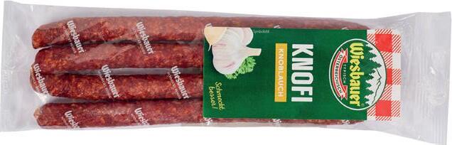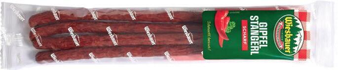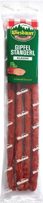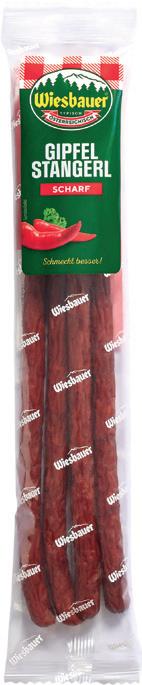 Die Spezialität aus dem Hause Wiesbauer: die Bergsteiger. Hergestellt aus hochwertigem Schweine- und Rindfleisch wird sie über aromatischem Buchenholz heiß geräuchert. Dieser Dauerwurstklassiker ist durch Ihren saftigen Geschmack und kräftigen Biss zu Recht in aller Munde.