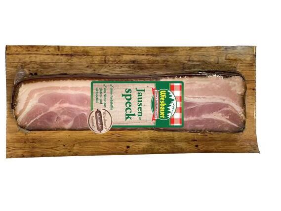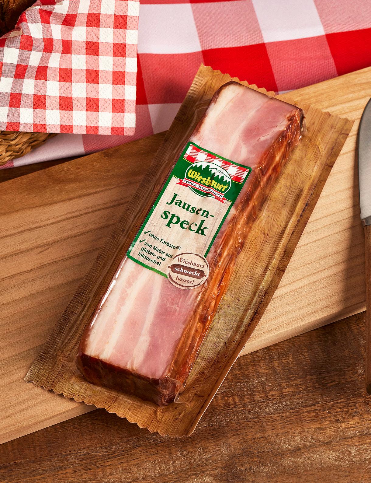 Beim Jausenspeck wird ausgesuchtes, mageres Schweinebauchfleisch mild gepökelt, sorgsam durchgegart und über aromatischem Buchenholz geräuchert.