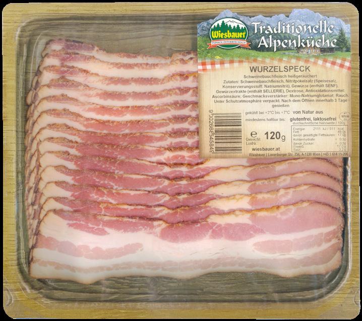 Ausgesuchtes mageres Schweinebauchfleisch mild gepökelt; sorgsam durchgegart.