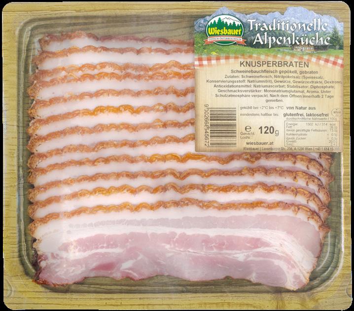 Mild gepökeltes und zart gebratenes, edles Schweinebauchfleisch; mit goldbrauner Kruste.