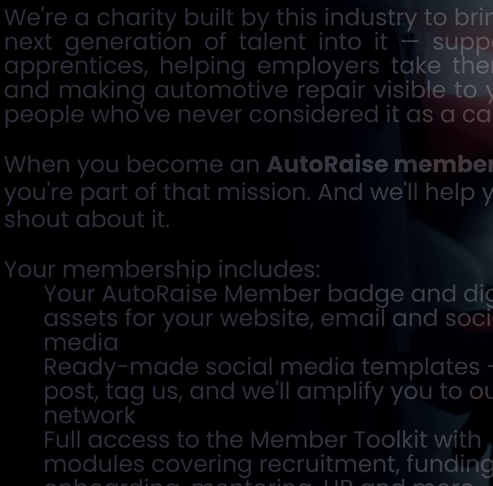 We're a charity built by this industry to bring the next generation of talent into it — supporting apprentices, helping employers take them on, and making automotive repair visible to young people who've never considered it as a career.
